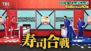 『水曜日のダウンタウン』4/8(水) よる10時 ■寿司合戦チャンピオントーナメント 食べた寿司皿は自陣に積んでも、相手が積み上げた皿を崩すために投げてもOK…最終的により多くの皿を積み上げたコンビの勝利となる「寿司合戦」が1年ぶりに復活!前回大会の決勝コンビ3組に新たな刺客も加えたチャンピオントーナメントで、真の初代王者がついに決定する!