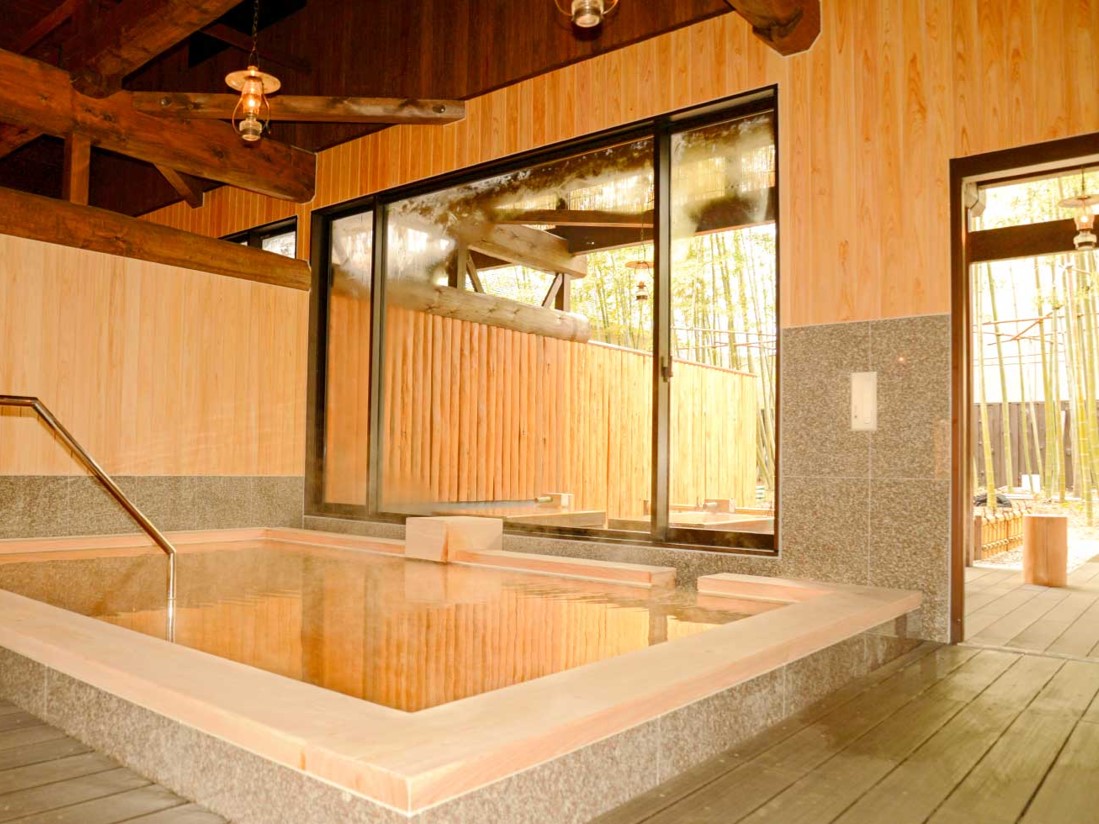 らんぷの灯かりに照らされた浴室は檜風呂の和の香りが漂います。竹林を眺めゆったりできる出雲の名湯です。