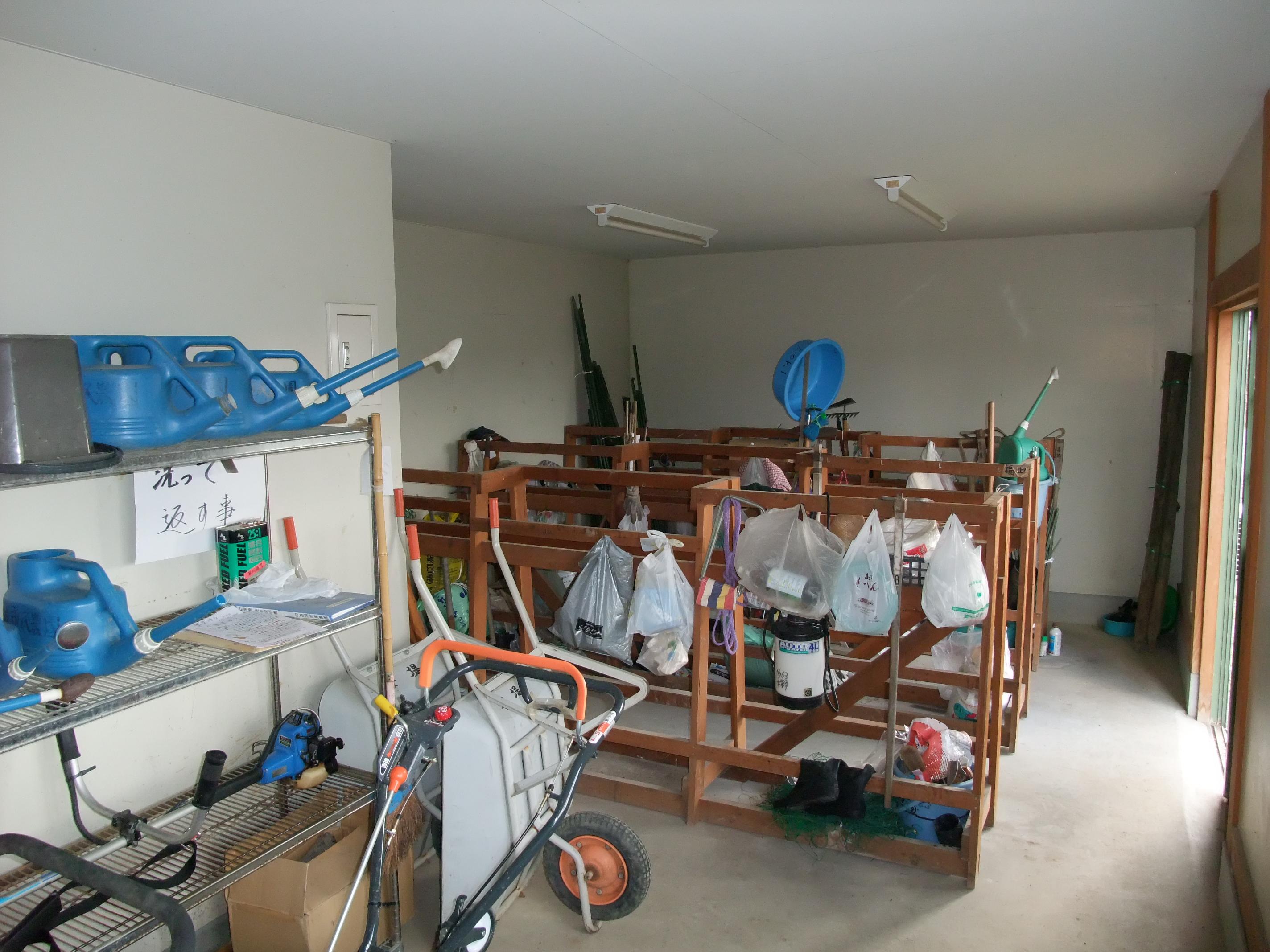 1区画約35㎡で、駐車場、洗い場、男女別の水洗トイレ、農機具収納施設もそろっている他、じょうろ、鍬、草刈り機などの貸し出しもあります。